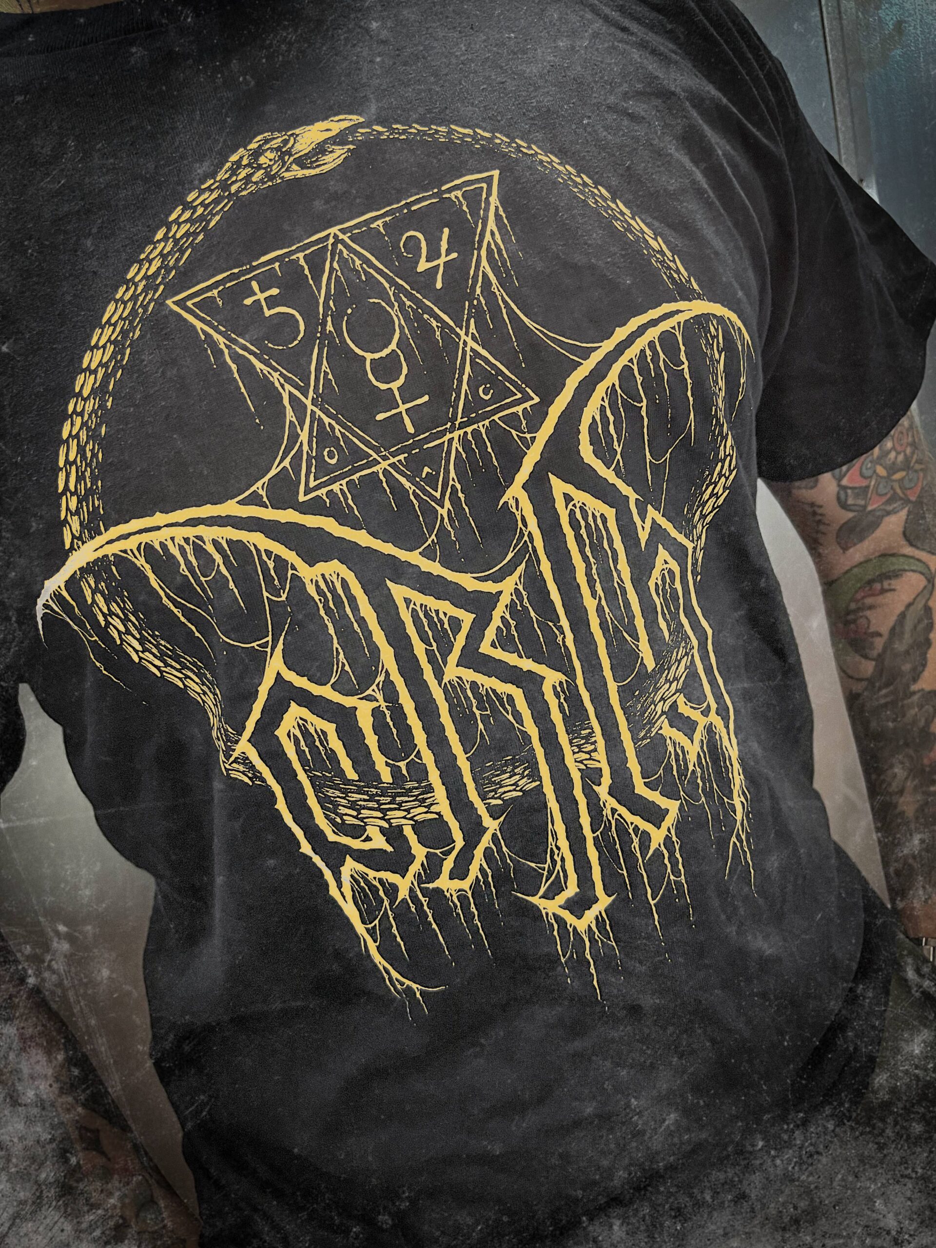 Classic ORM Logo printed in Gold ink, with the sun-serpent on the back